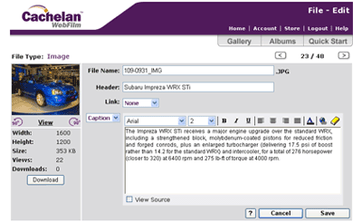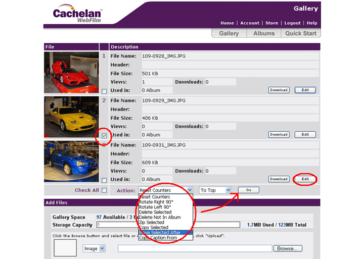 After your images and files have uploaded you can edit them in the gallery. Using the check boxes beside each image and the toolbar below you can customize the look of your image. If you check off the box beside the image you would like to edit you can Delete, Move, Copy, Zip or Rotate it. Moving the images and files will have no effect on their position in the album and should only be done if you would like to group your files and images so they are easier to look through. If you click the "Reset Counters" button then the Downloads and Views counter for each image will return to zero.